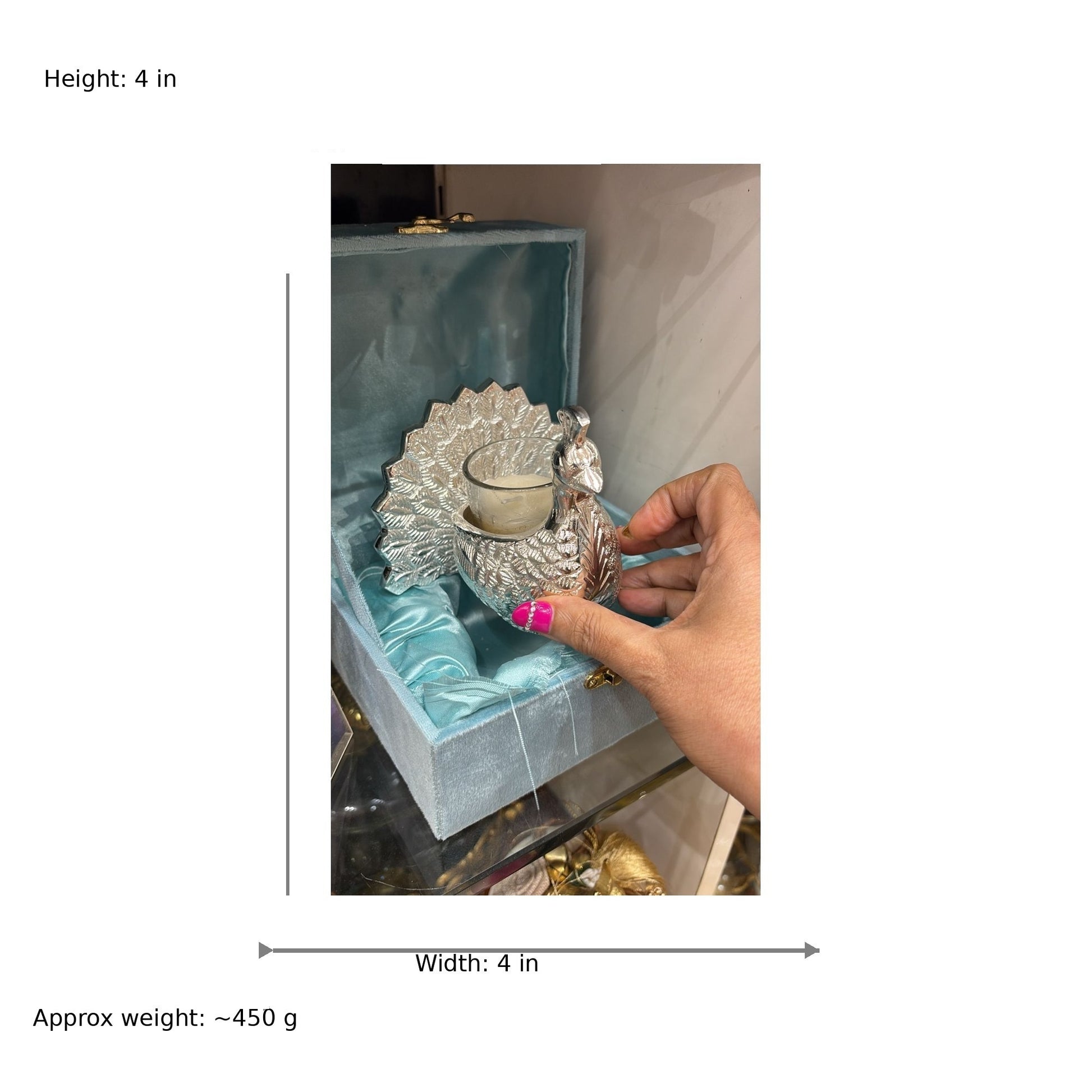 Bring the radiance of Diwali into your home with this exclusive handcrafted Peacock Candle/Lamp Holder, made in fine German Silver. The majestic peacock design reflects grace, beauty, and festivity, making it a centerpiece for your pooja room, dining table, or living space.