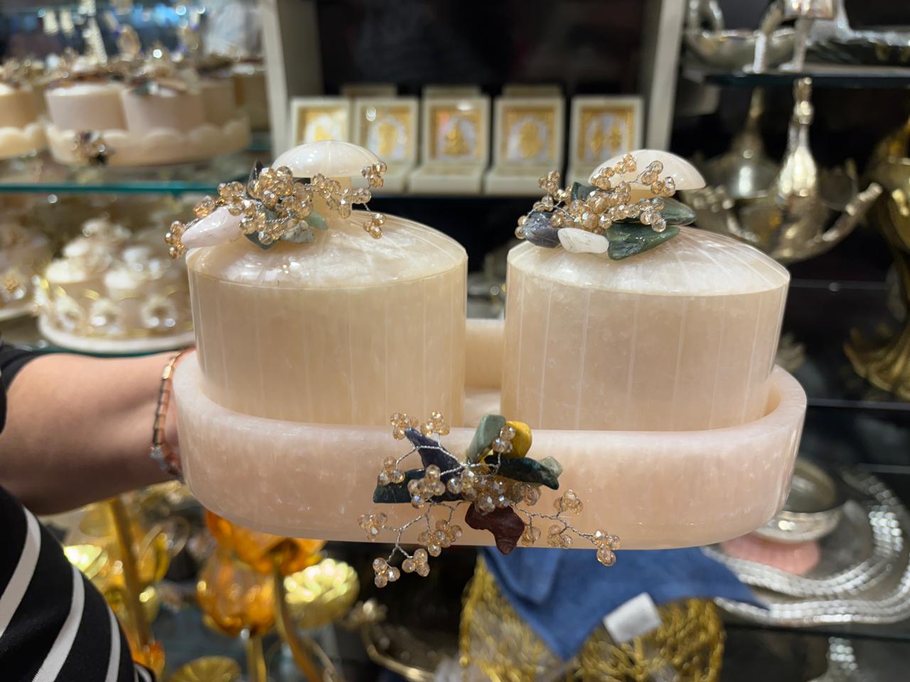 This Diwali, gift not just sweets but a keepsake of elegance. Our Handcrafted Dual Dry Fruit Container Set is carved in premium stone, adorned with delicate gemstone & floral embellishments that reflect richness and celebration.